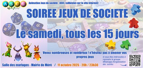 L’ASCL vous convie à une nouvelle soirée jeux de société, samedi 11 octobre, à 20h00. Elle aura lieu à la salle de la mairie de Méré..